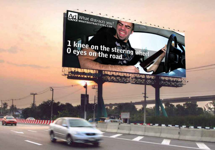 The “What distracts you?” group campaign targets reckless teen drivers by providing exaggerated scenarios for drivers. The magazine ad puts the phone and wheel in the hands of the viewer to create the eerily familiar scene of texting while driving.